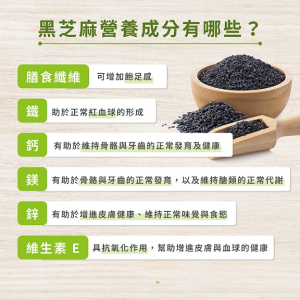 黑芝麻富含高鈣、鐵、膳食纖維、不飽和脂肪酸及芝麻素。具備強效抗氧化、降低膽固醇、改善便祕、護心血管及補鈣防骨鬆蓋。