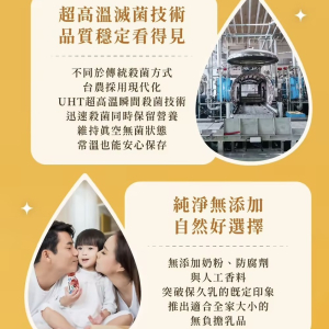 100%生乳,最濃純香的選擇,品嘗原始好滋味台農採用現代化 超高溫殺菌技術 殺菌同時保留營養無添加奶粉 防腐劑與人工香料 適合全家大小的無負擔飲品可常溫保存,是家中常備保久乳的好選擇 孩子們想喝隨時喝!補充營養麥芽風味:嚴選麥芽粉搭配香濃牛乳,獨特麥芽香氣,是特殊風味乳中,無可取代的好滋味!