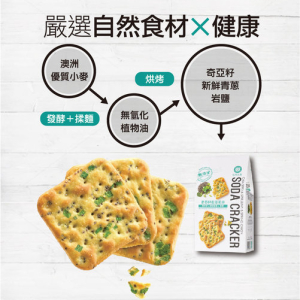 嚴選澳洲優質小麥,經自然發酵數小時後揉麵,加以無氫化棕櫚油進行烘烤,經烘烤後加入多種香草粉,及黑白胡椒和鑽石鹽,胡椒的風味加上植物香辛料香氣,讓您有別於傳統蘇打餅的體驗,不油不膩少負擔。